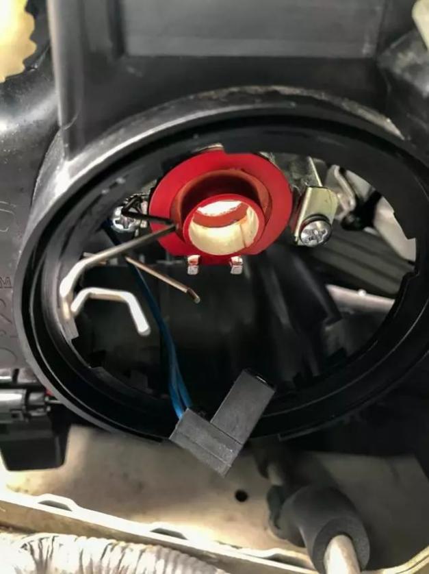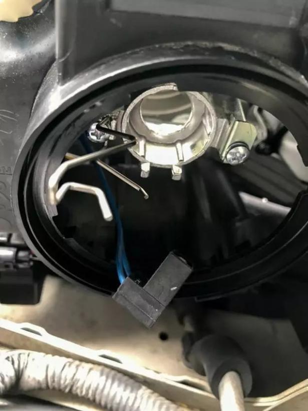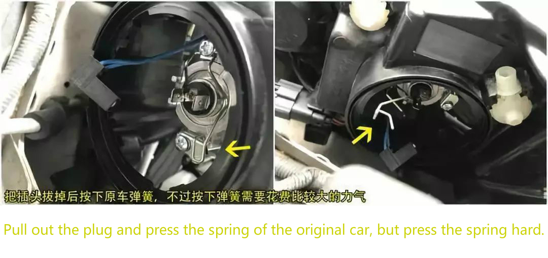 2)Saque la cubierta recubierta de goma para proteger la carcasa del faro de la humedad. Luego, tire del tapón y presione hacia abajo en el resorte del automóvil original utilizado para fijar la bombilla.
